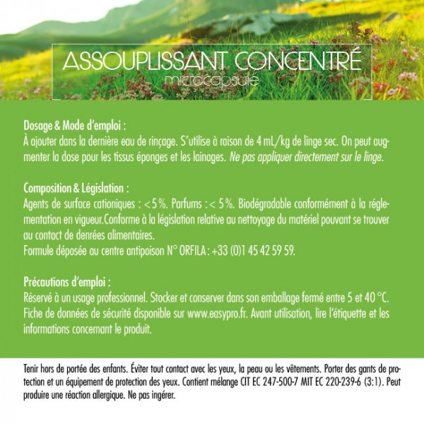 Este suavizante profesional neutraliza el contenido alcalino de los restos de detergente y restablece el pH de la ropa al de la piel. Facilita el secado mejorando la extracción del agua durante el centrifugado y el planchado. Devuelve flexibilidad a la ropa y le proporciona un tacto suave. Nuestro suavizante frescor también ayuda a reducir la electricidad estática de la ropa; Su fórmula concentrada es económica: se utilizan sólo 4 ml de producto por kilo de lavado en seco. Gracias a su composición enriquecida con microcápsulas de fragancia, deja su colada con un aroma fresco que se renueva continuamente... ¡incluso varios meses después! Sus microcápsulas permanecen en la ropa guardada en un armario y se rompen al entrar en contacto con la piel. 20 litros de suavizante en una bolsa en caja suavizan 5000 kg de ropa seca (según la dosis mínima necesaria).