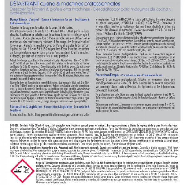 - Para la desincrustación del lavavajillas/lavadora: diluir 50 mL por litro de agua. Llenar la máquina con agua y añadir el detergente líquido. Poner en marcha el dosificador automático y hacer circular el agua durante 10 a 15 minutos. Escurrir y aclarar varias veces con agua potable.