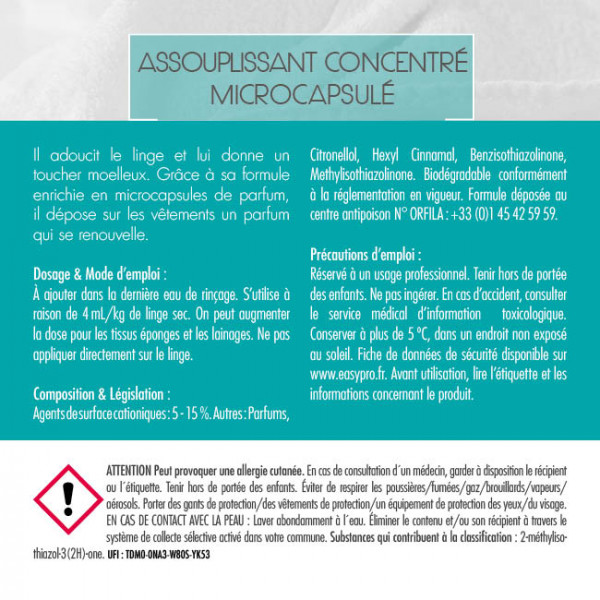 ¡Pruebe su agradable fragancia Azur que evoca una fuente inagotable de frescor! Es un producto ideal para profesionales (hoteles, bed and breakfasts...) y particulares. Un bote de 2 L suaviza 500 kg de ropa seca(dependiendo de la dosis mínima requerida).